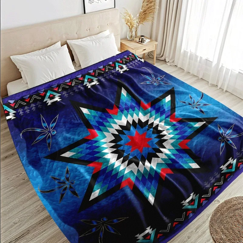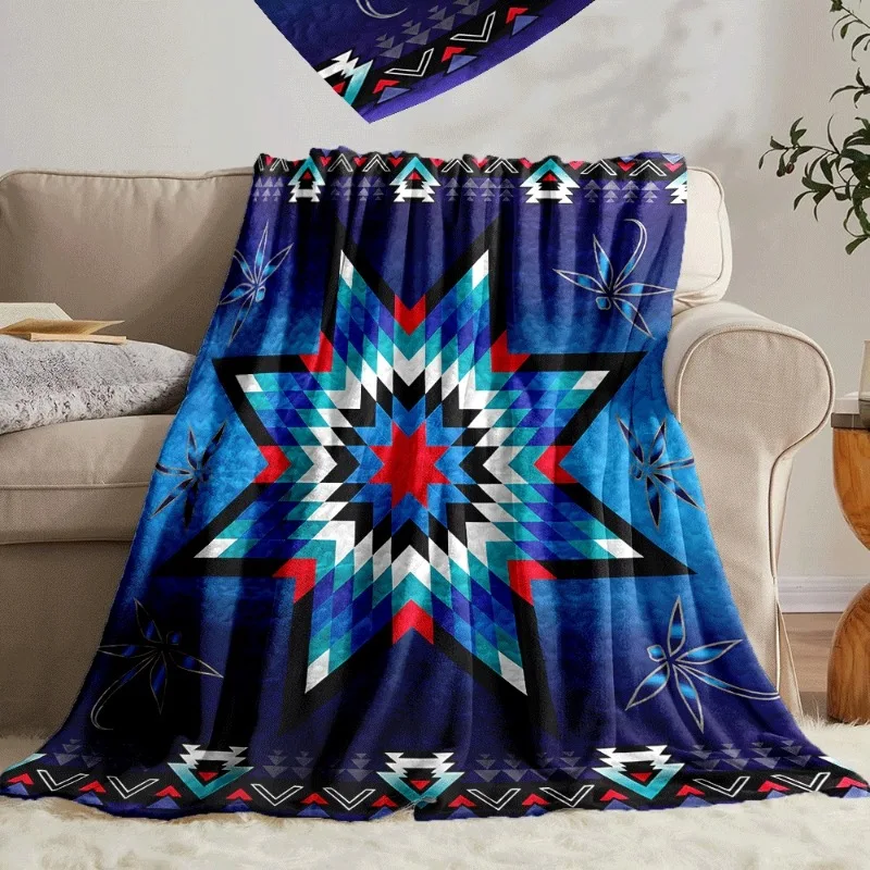 Native American Indian Style Quilted Flannel Blanket - All-Season Southwestern Tribal Bedspread with Star & Motifs Turquoise